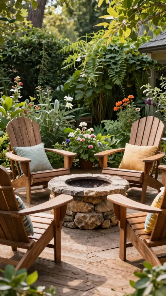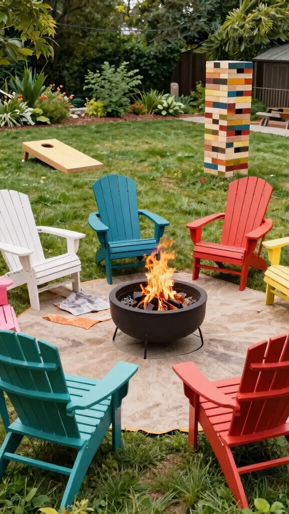 Make your backyard a fun haven for families with a friendly Adirondack chair setup. Choose durable, colorful chairs and surround them with a spacious fire pit that accommodates everyone. Incorporate outdoor games like corn hole or giant Jenga to keep the excitement going before and after gathering around the fire.