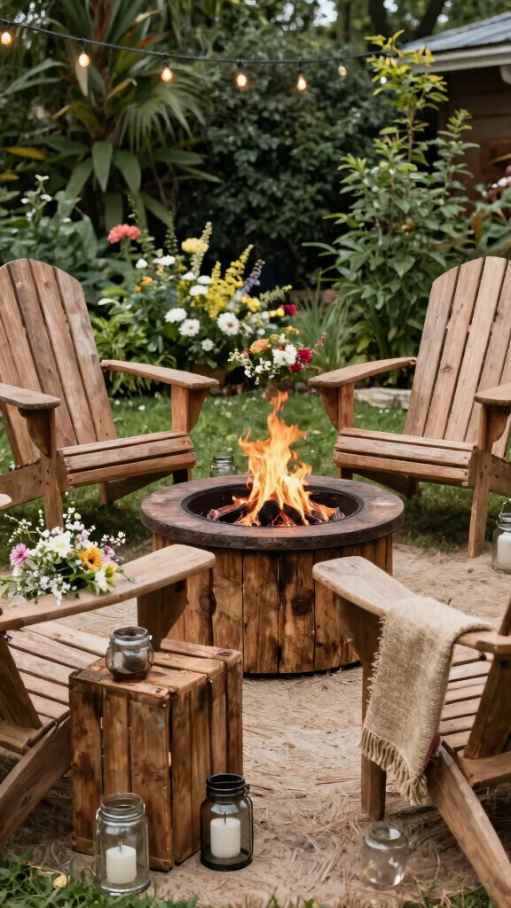 Start with a natural surround—stone or gravel fire pit ring and native plants that require less water. Use Adirondack chairs built from sustainable materials and add simple, durable cushions. Add solar-powered lighting, reclaimed wood planters, and a weatherproof throw blanket for chilly nights to boost backyard decor without waste. Keep color palette earthy and cohesive to highlight the garden furniture and outdoor seating around the pit. Finally, consider a rain barrel for watering plants, reinforcing sustainability as part of your cozy outdoor living setup.