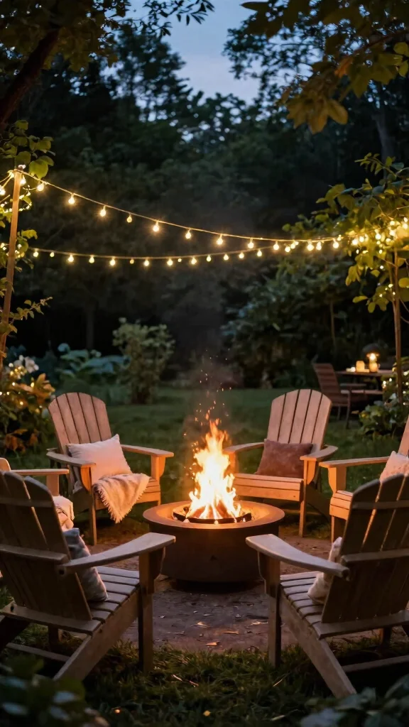 Cozy evenings shine brightest when your adirondack chairs fire pit setup pairs soft blankets with warm light and string lights overhead. Relaxed comfort invites lingering—just swap in cushions and a fire pit that complements the lighting for a cohesive, eco-friendly retreat.
