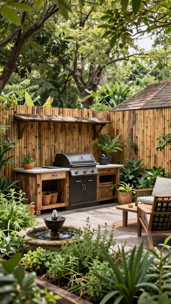 Imagine a barbecue area that feels like a slice of nature. You can enjoy grilling while surrounded by fragrant herbs and lush greenery. This charming setup not only looks inviting but also offers fresh ingredients right at your fingertips, promoting a healthy lifestyle. The tranquil sound of a nearby fountain adds to the peaceful ambiance, making it an ideal space for cooking and unwinding.