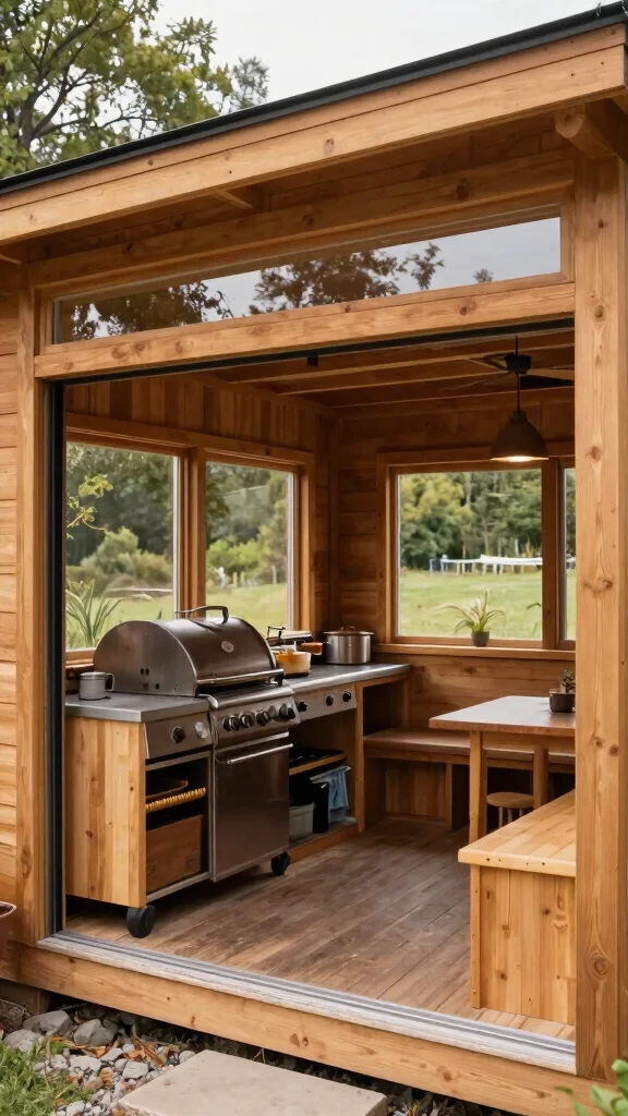 An open-air cooking cabin offers the best of both worlds: enjoy the outdoors while being sheltered from the elements. Constructed from sustainable wood with large windows, this cozy space can house a grill, prep area, and even a small dining nook. The design promotes airflow while ensuring a functional cooking area, making it a versatile addition to your backyard.