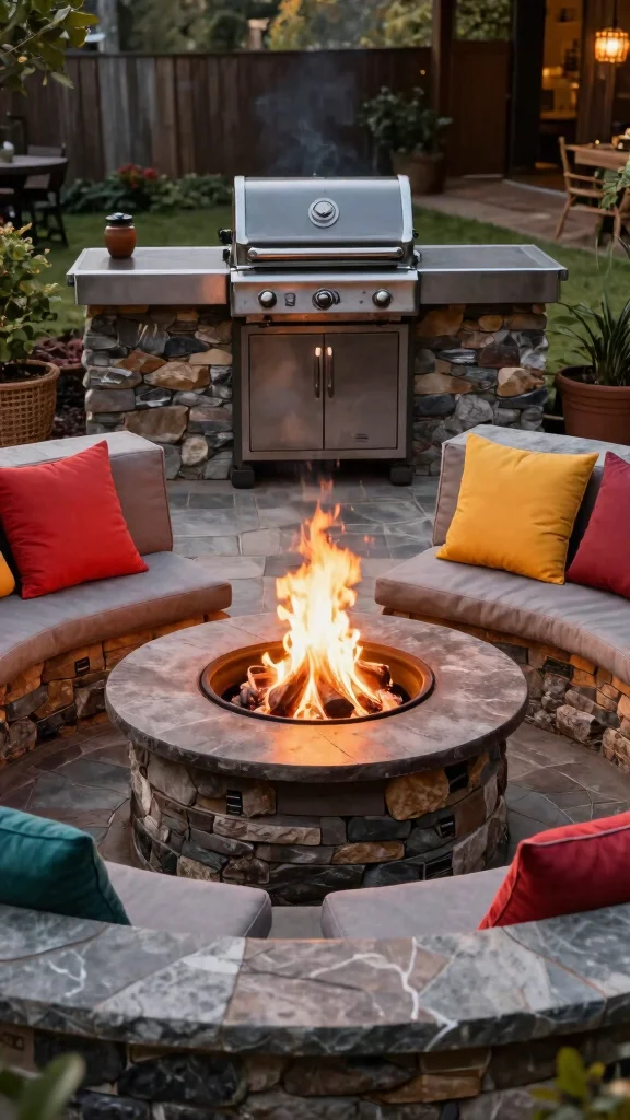 Combine the cozy allure of a fire pit with your barbecue area to create an inviting outdoor lounge. A built-in grill positioned next to a warm fire pit encourages social interactions, where friends can cook, share stories, and relax together. Eco-friendly materials for seating and the grill enhance sustainability, while natural stone or recycled materials add to the aesthetic charm.