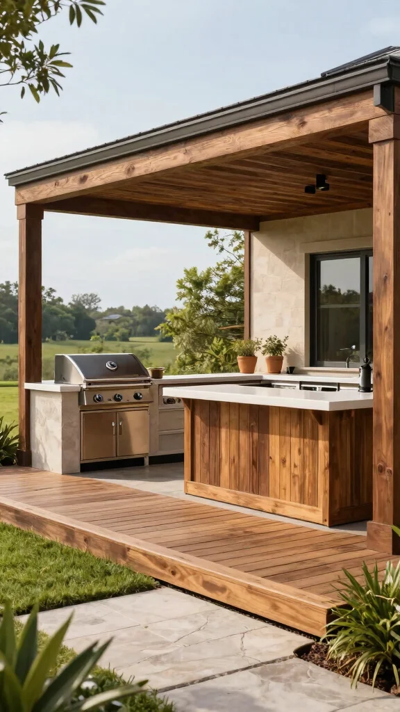 Small spaces can be elegant and efficient with the right plan. Use modular, multi-function pieces—fold-down counters, a built-in grill, and pull-out waste and storage to save space. Choose sustainable materials like recycled stone countertops, weatherproof bamboo, and powder-coated steel. Integrate a compact rainwater catchment for cleaning, a simple compost bin for kitchen scraps, and drought-tolerant plants around the perimeter to reduce irrigation. Add solar-powered lighting and a shaded dining corner using a pergola or vines. For inspiration, explore outdoor kitchen ideas that optimize backyard grilling spaces and patio barbecue setups while staying green.