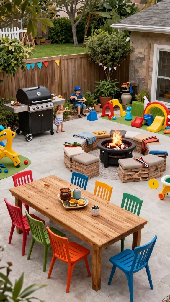Transform your backyard into a family-friendly BBQ paradise where everyone can enjoy! This design includes a built-in grill, spacious dining area, and even a play zone for kids. Bright colors and fun decor make it inviting, while eco-friendly materials ensure sustainability. Add a cozy fire pit for roasting marshmallows, combining fun with practicality for memorable family gatherings.
