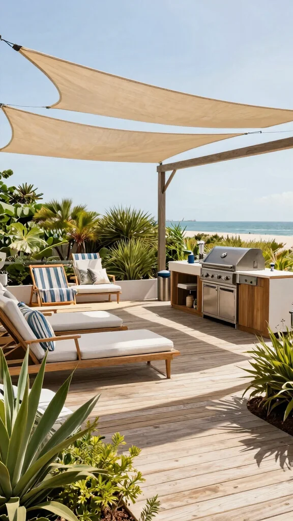 This eco-conscious coastal grill area brings a relaxed beach vibe to your backyard. The wooden deck surrounds a stylish grill, while comfy lounge chairs invite you to kick back. Designed with native plants that require little upkeep, this setup respects the coastal environment. Rainwater collection systems can enhance sustainability, while shade sails provide protection from the sun.