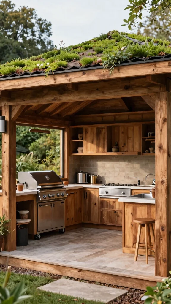 Elevate your outdoor cooking experience with an eco-friendly pavilion that blends shelter with style. Built from reclaimed wood and featuring a green roof, this space emphasizes sustainability. Inside, a full kitchen setup includes a grill, sink, and ample storage, while built-in seating invites guests to relax. Solar panels can power the area, enhancing its eco-friendly appeal.