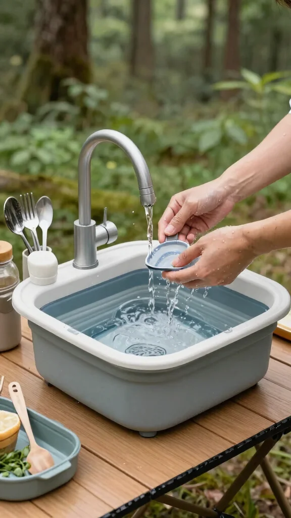This can be as simple as a collapsible wash basin filled with water or a more advanced setup with a hand-pump for running water. Having a designated washing area makes your cooking process more hygienic and convenient.