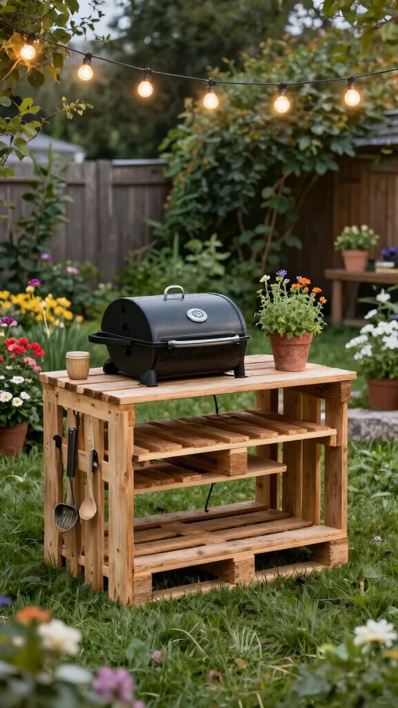 Using pallets, you can create a solid base for your charcoal grill and build shelves for extra storage. Paint them to match your outdoor theme or leave them natural for that rustic charm. Adding hooks for utensils and a small herb garden can enhance both practicality and aesthetics.