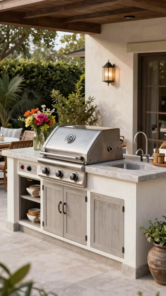 A patio island with a built-in charcoal grill offers a dedicated outdoor cooking area that’s ideal for entertaining. These setups often feature meal prep countertops, storage for grilling tools, and sometimes additional amenities like sinks or mini-fridges.