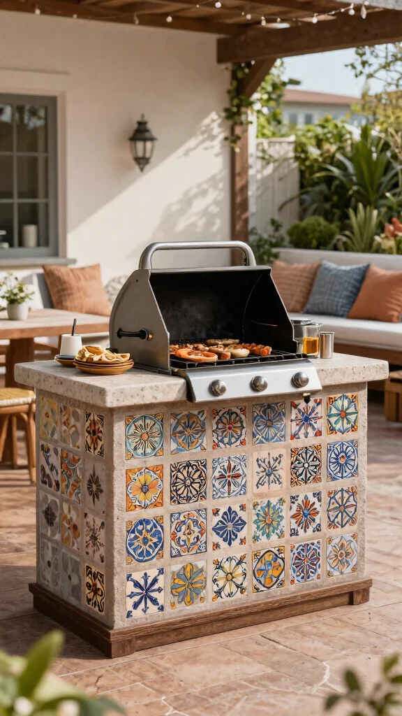 Choosing colorful or patterned tiles not only makes cleaning easier but also creates visual interest, turning your grill station into a conversation starter. It’s a lovely way to blend function with beauty in your outdoor space.