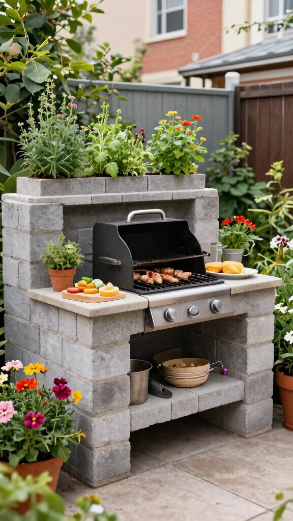 9. Cinder Block Grill Station with Built-in Planters