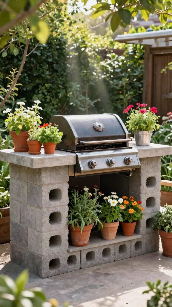 Want to blend nature with your outdoor cooking? A cinder block grill station with built-in planters is a beautiful way to incorporate greenery into your grill area. This design not only serves as a functional cooking space but also adds life and color to your setup.