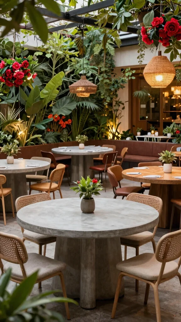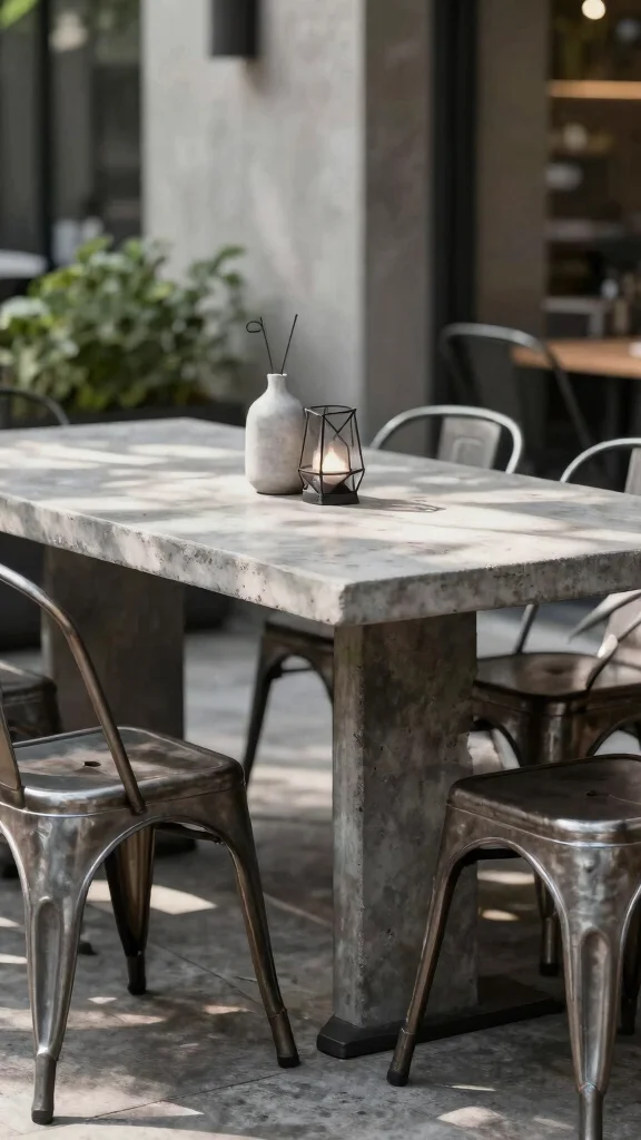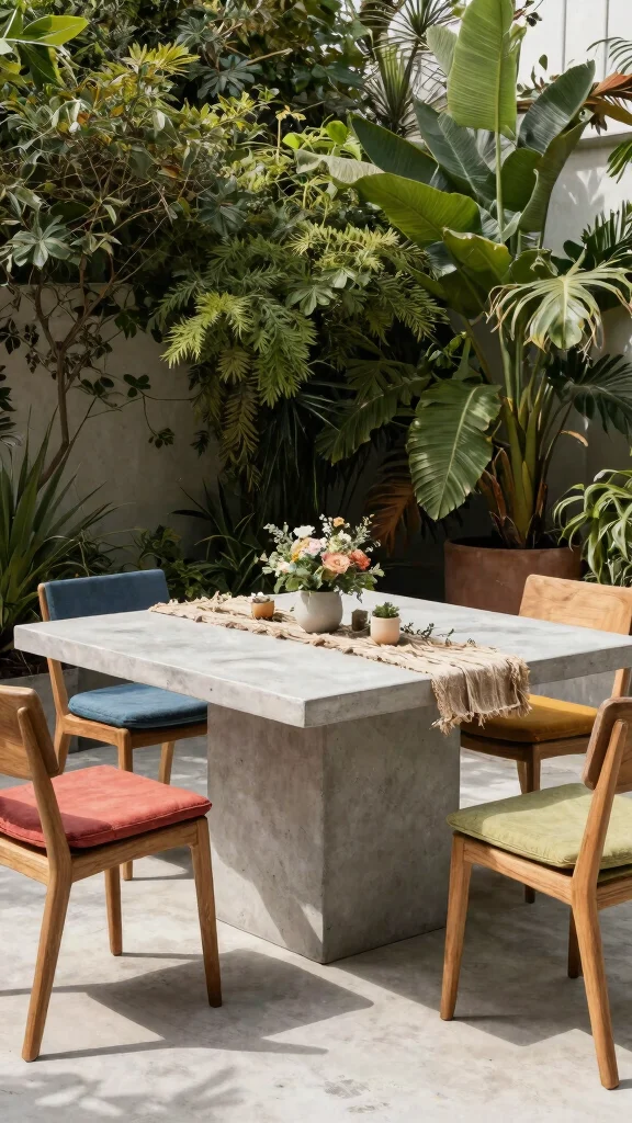 To create a cohesive look, pair a concrete outdoor dining table with durable outdoor furniture like teak, powder-coated aluminum, or weathered steel. Mix textures: natural wood chairs with a metal table, or woven rattan for contrast. Use UV-resistant cushions in a color palette that complements your space to achieve stylish outdoor dining. Plan the layout for conversation and accessibility, ensure chairs tuck neatly, and protect against sun and rain with shade and covers. Finally, match the feel of your modern dining decor by repeating color accents or material cues across planters, lighting, and textiles.
