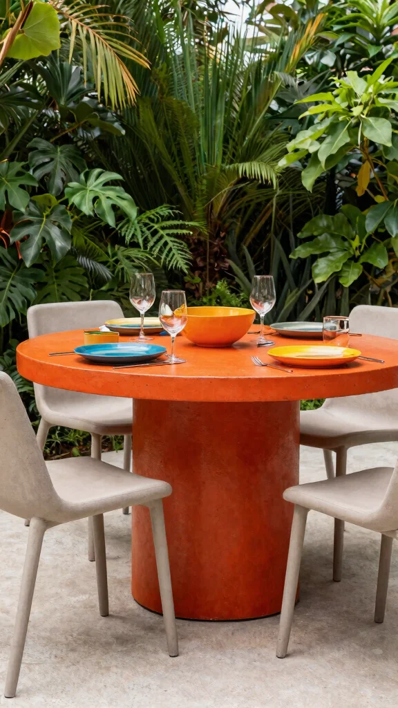 Available in a variety of hues, from rich blues to vivid reds and greens, these tables challenge the conventional gray concrete look, allowing homeowners to express their unique style. Pairing them with neutral chairs enhances their vibrancy while achieving a balanced aesthetic.