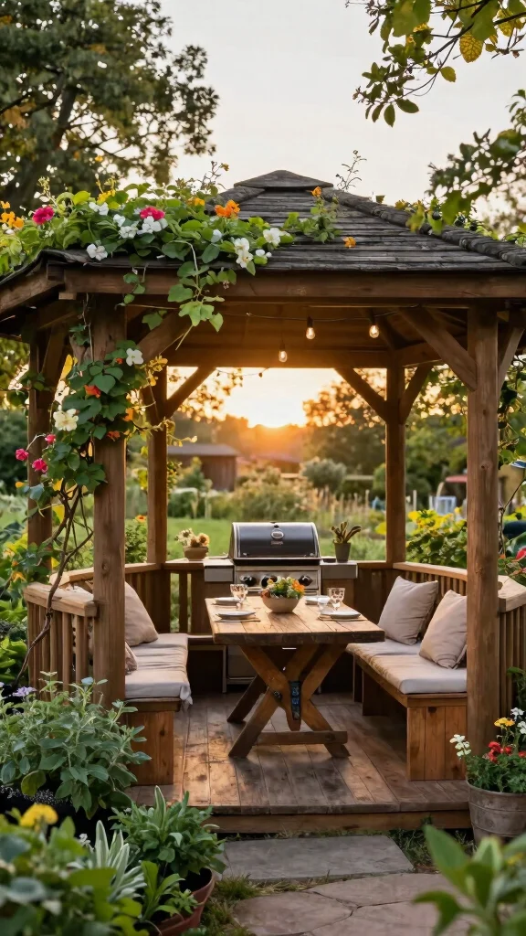 Picture yourself grilling under an elegant gazebo, surrounded by nature. This charming setup not only shields you from the rain but also elevates your outdoor gatherings with its rustic wooden design and twinkling lights. You’ll enjoy the fresh air while creating delicious meals, all while impressing your guests with the beautiful ambiance.