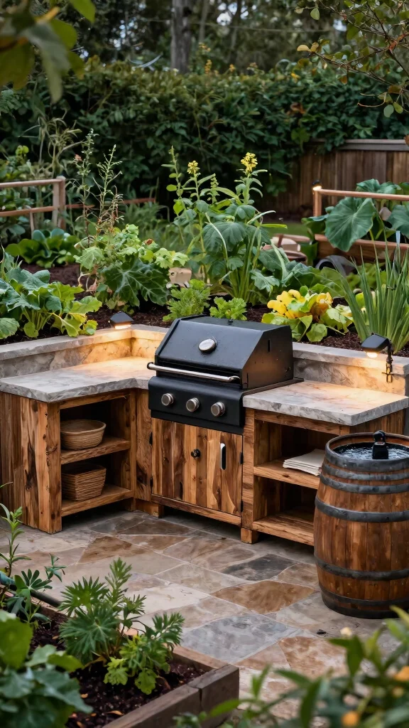 Adding a compost bin encourages waste recycling, enriching your garden and promoting sustainability. Pair your grill with natural stone countertops and reclaimed wood to seamlessly blend functionality with eco-friendliness.
