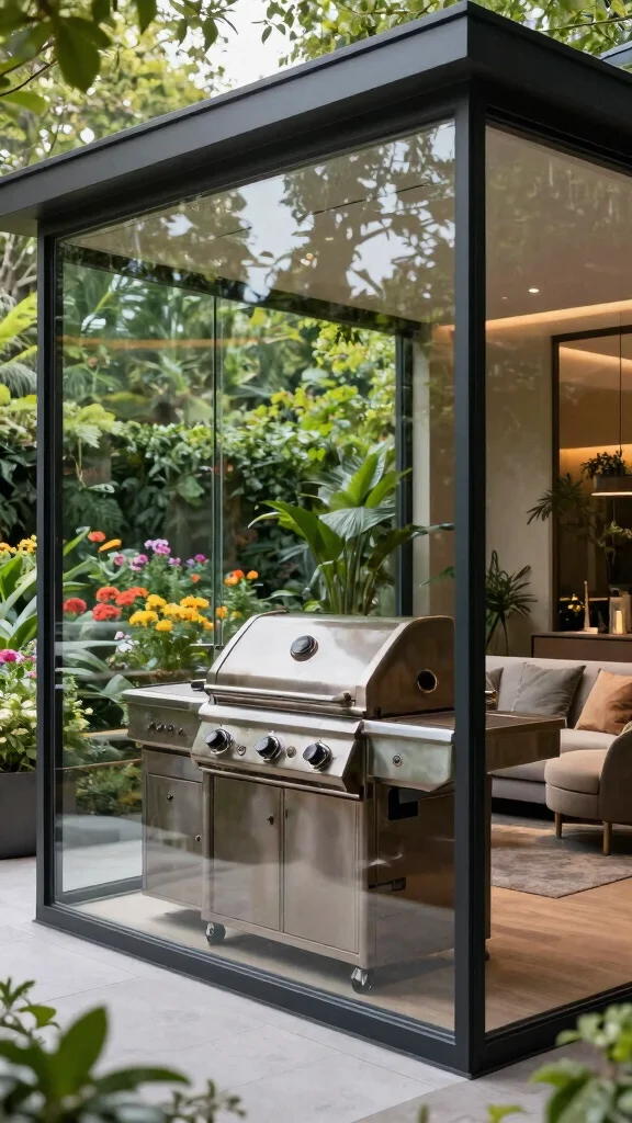 Elevate your outdoor cooking experience with a stunning glass-enclosed grill sanctuary. This unique setup protects you from the elements while providing breathtaking views of your garden. The natural light that floods the space adds to the luxurious feel, making it your go-to cooking area year-round.