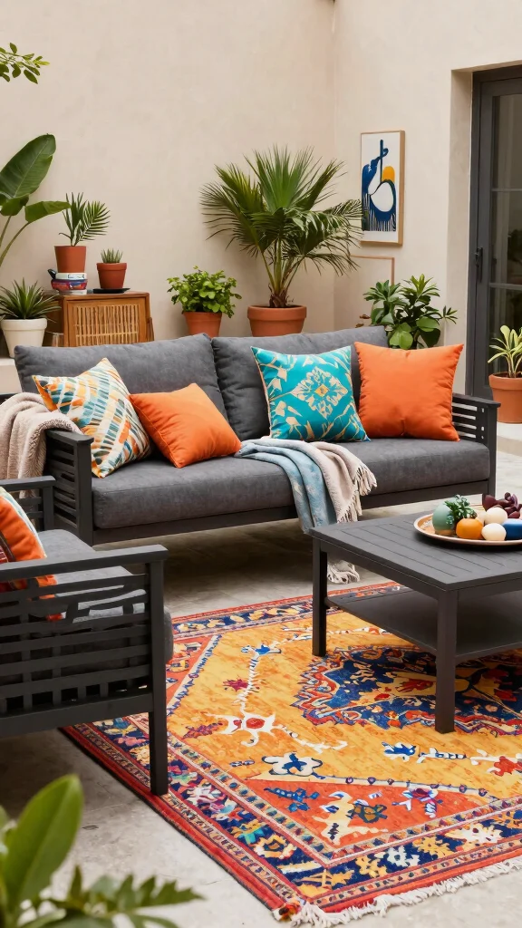 Repeat a single accent color across pillows, throws, and accessories to create cohesion, while varying textures (metal, wicker, concrete) to add depth. Stay true to outdoor furniture trends and garden furniture styles by pairing charcoal pieces with olive greens, soft whites, or warm terracotta tones. For smaller spaces, keep color usage restrained to avoid visual heaviness and maintain a modern patio designs feel.