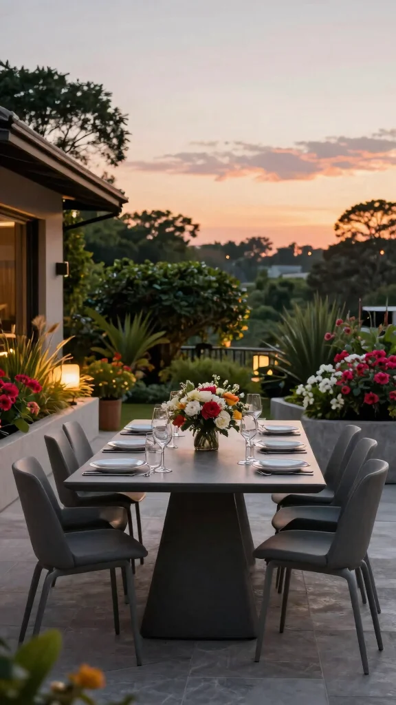Elevate your outdoor dining experience with a sleek dark grey dining set that embodies modern sophistication. The combination of a rectangular table with streamlined chairs promotes functionality while seamlessly blending style. This setup transforms alfresco dining into a memorable occasion, making every meal feel special. Opt for materials like aluminum or powder-coated steel to ensure durability, allowing your dining set to withstand the elements. To make your dining area even more inviting, consider adding a striking centerpiece, such as a vase filled with fresh flowers or a collection of candles for a cozy dinner ambiance.