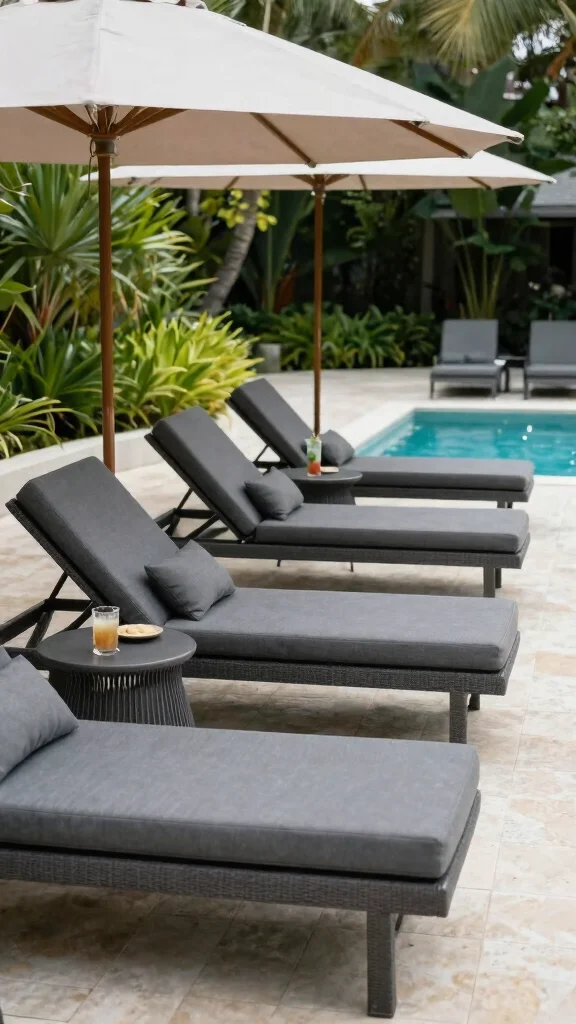 Indulging in sun-soaked relaxation is elevated with dark grey sun loungers that combine style and comfort. These trendy loungers provide a sleek look, perfect for laid-back summer days. Look for adjustable loungers that allow you to find the ideal position for sunbathing or reading. Pair them with a stylish side table to create a complete setup, great for holding drinks and snacks. To elevate your space further, consider adding an umbrella in a complementary color for extra shade.