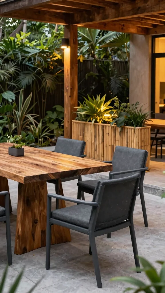 Opt for modular seating that can be rearranged for gatherings, and use a slim coffee table or nesting tables to save space. Define zones with a lightweight outdoor rug to create structure without crowding floor area, and add vertical greenery or a slim trellis to bring in nature without stealing square footage. Finish with layered lighting to extend usability after dark. This approach embraces modern patio designs and sleek outdoor decor while highlighting dark grey patio furniture as the core element.