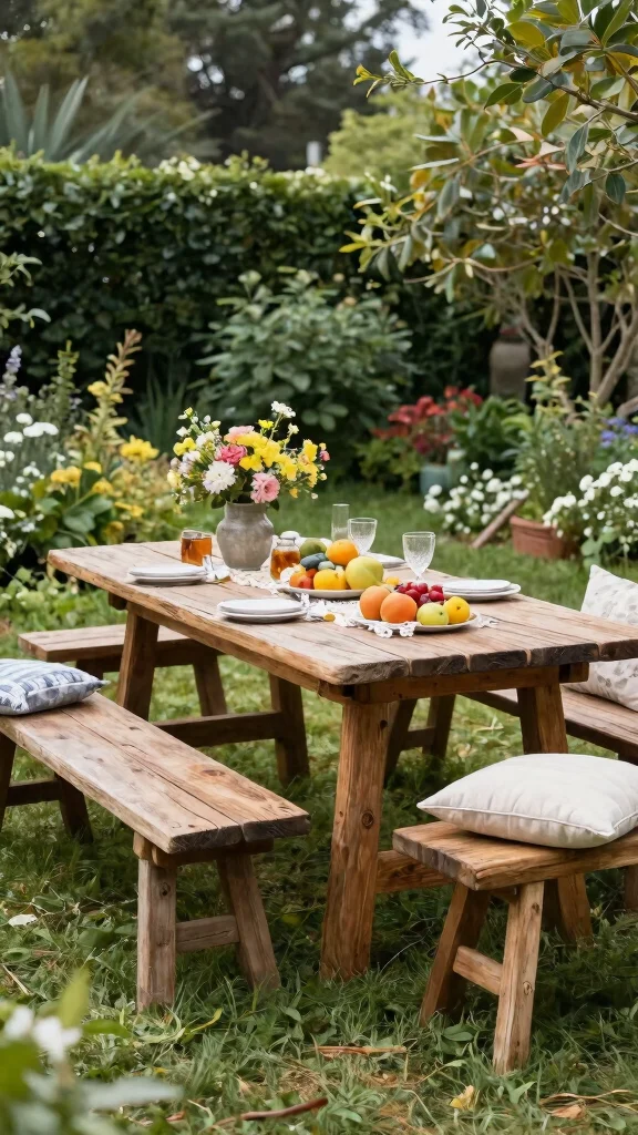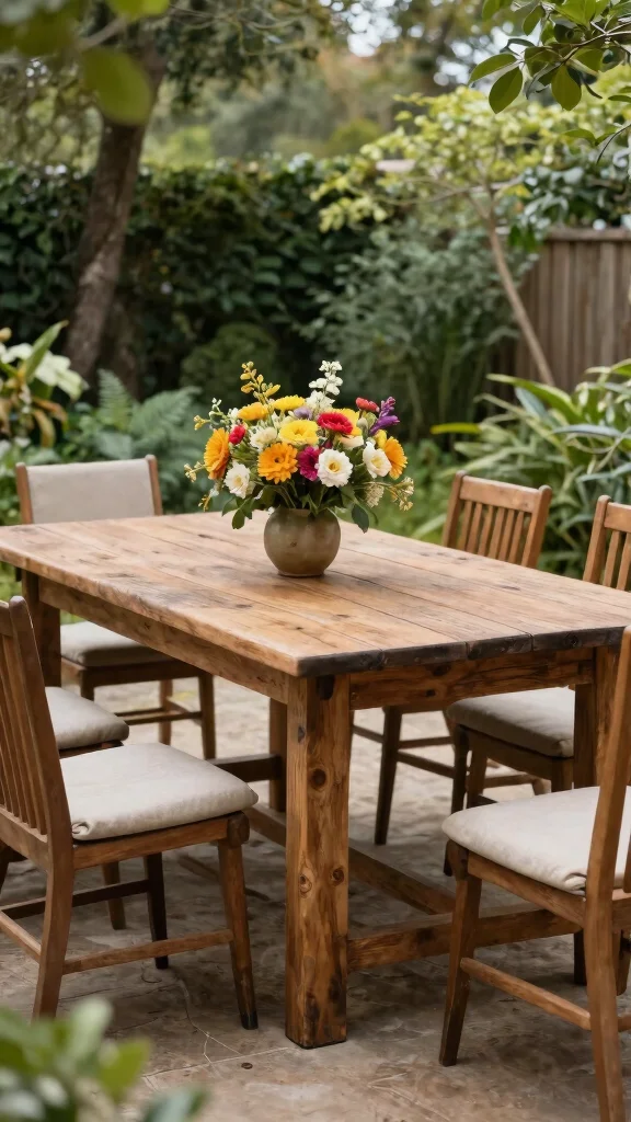 Fun fact: an extendable wood farmhouse table on a small patio can boost seating from 4 to 10 in moments. Its rustic charm and sturdy legs invite relaxed gatherings with mismatched chairs and comfy cushions.