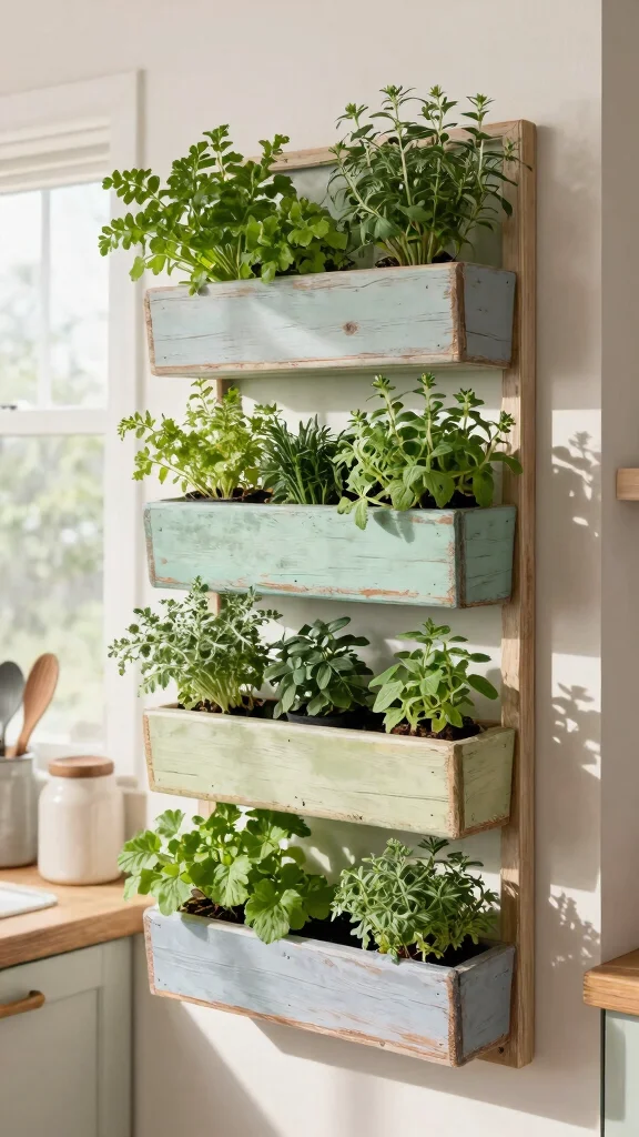 Create a vertical herb garden to maximize space in small kitchens, utilizing wall-mounted planters or shelves.