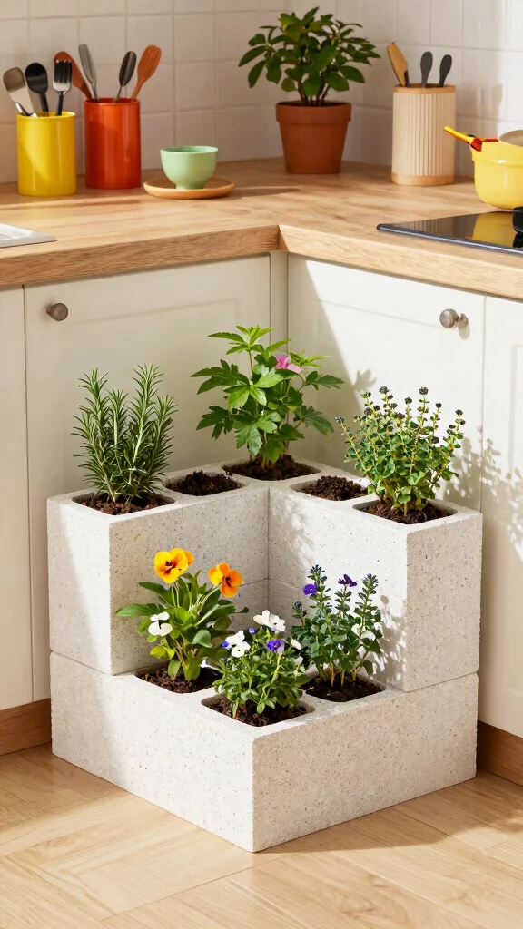 For a rustic yet practical gardening solution, try a cinder block herb garden! This budget-friendly idea uses cinder blocks as planters, letting you create a unique layout in your kitchen or balcony.