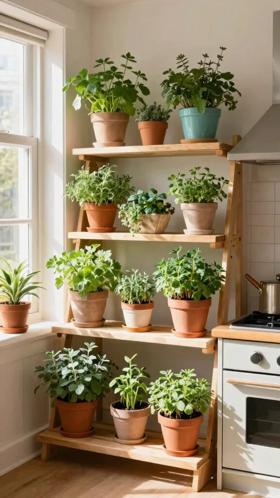 Mix herbs like basil, parsley, and rosemary to create an engaging visual display. With different levels, each plant maximizes sunlight exposure, ensuring they all thrive. This setup not only organizes your herbs but also serves as a stunning centerpiece in your kitchen.