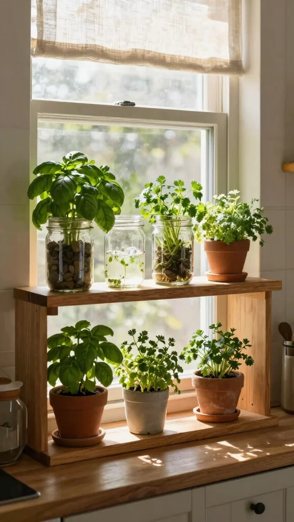 Window Shelf Garden Shallow pots, jars Basil, oregano, cilantro Rotate pots, use well-draining soil