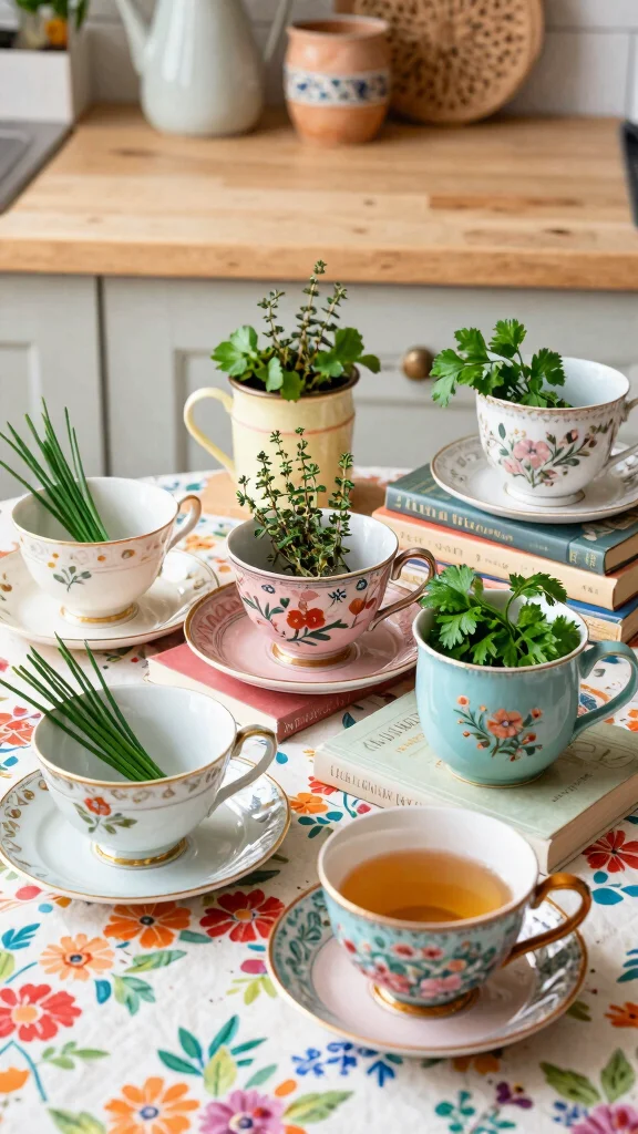 Transform old tea cups into charming planters for small herbs, adding a decorative touch to your kitchen.