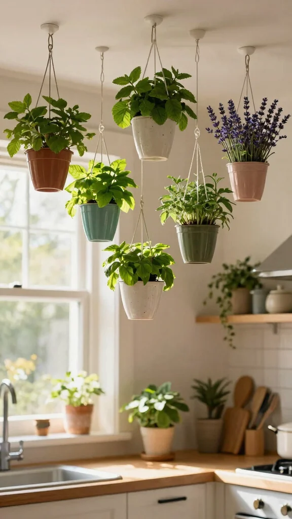 Want to make the most of your kitchen’s vertical space? Create a hanging herb garden! This inventive idea not only saves counter space but also adds a playful element to your kitchen decor.