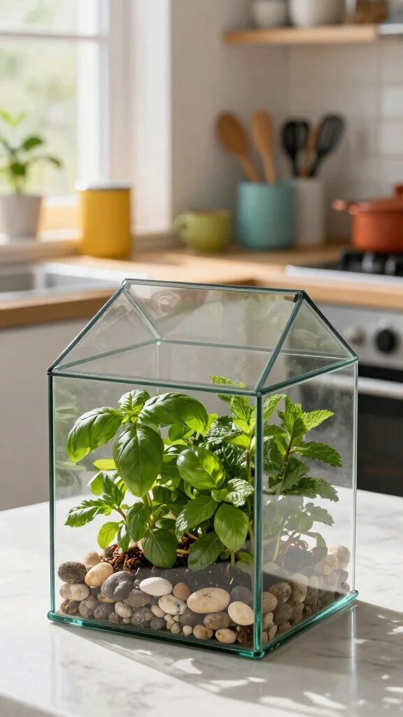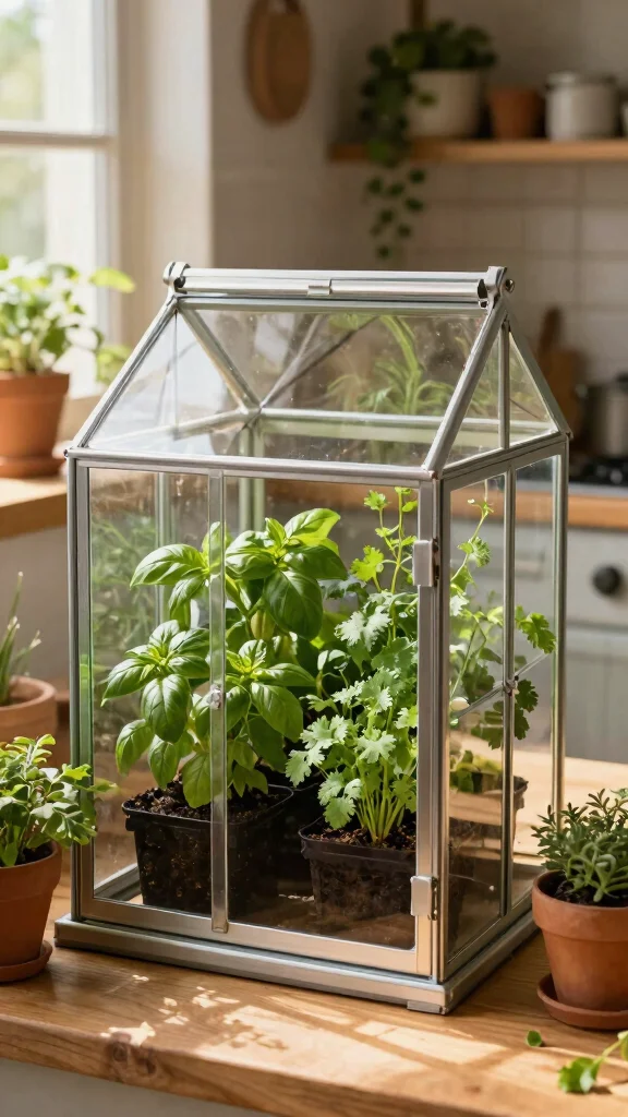 Consider a mini greenhouse to create a controlled environment for growing herbs year-round indoors.