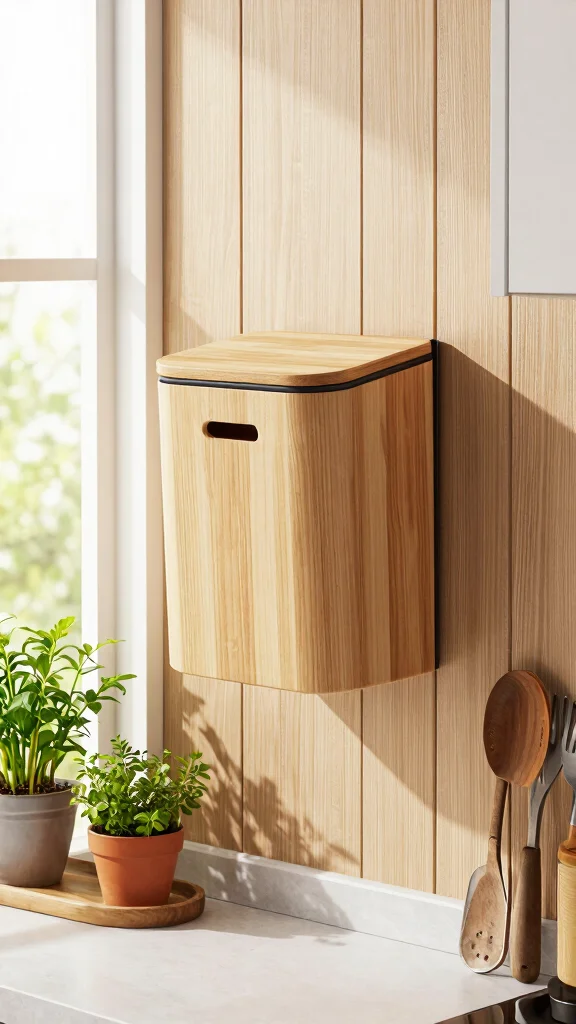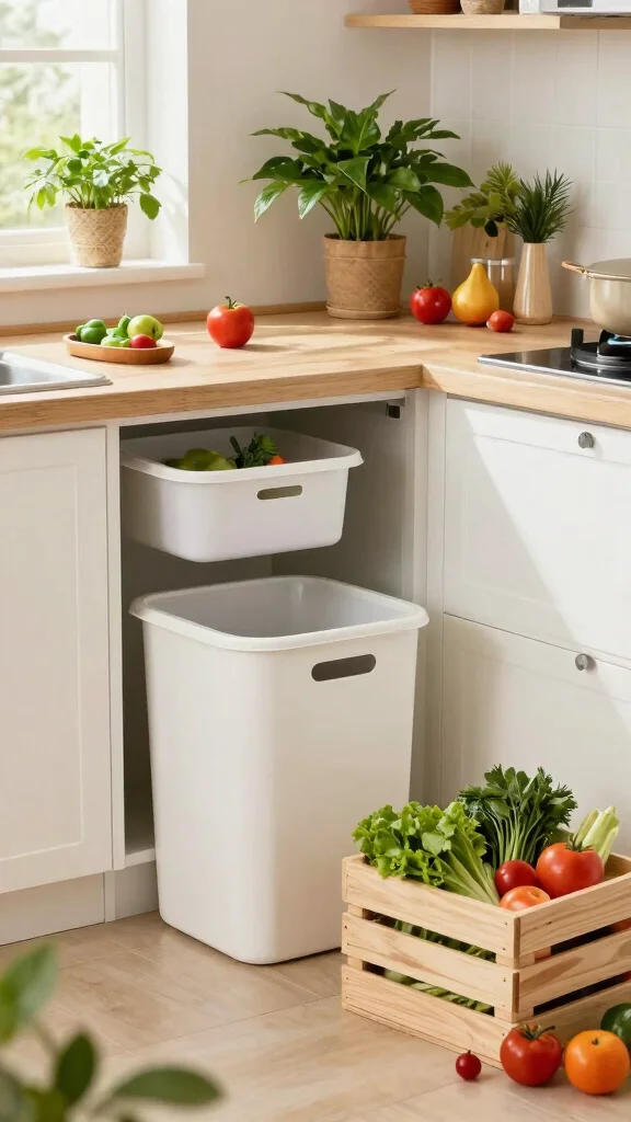 Create a hidden compost bin setup by installing a pull-out tray in a cabinet, or placing an inner bucket inside a decorative outer container that blends with your décor. Mount a slim bin inside a pantry or under the sink and use a cabinet door insert to disguise it. You can also use a counter-top bin with a matching cover that slides into a cabinet when not in use. The goal is effortless access for indoor compost solutions while keeping it visually unobtrusive for sustainable kitchen practices.