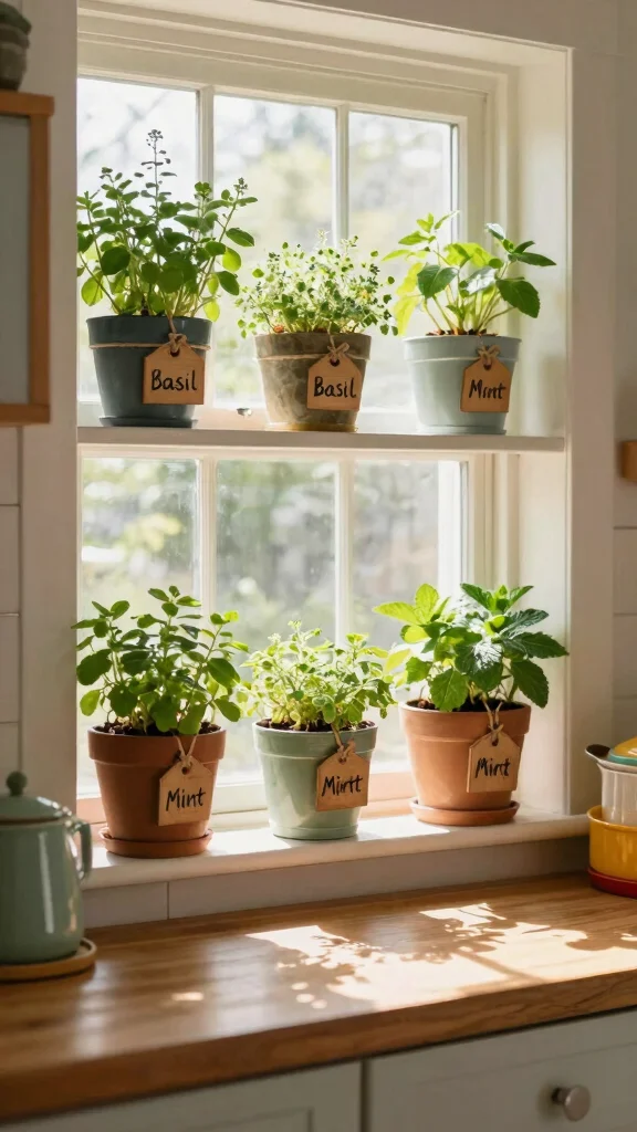 Choose chalkboard labels for a rustic feel or cute printed tags for a more playful touch. Involve your family by labeling pots with favorite herb names for a fun project! These thoughtful details make your kitchen herb garden feel uniquely yours, adding warmth and character to your culinary space!