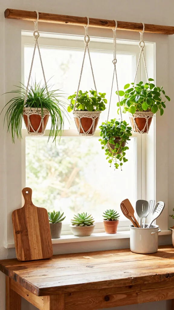 Incorporate hanging plant baskets to add a unique twist and save counter space while enhancing aesthetics.