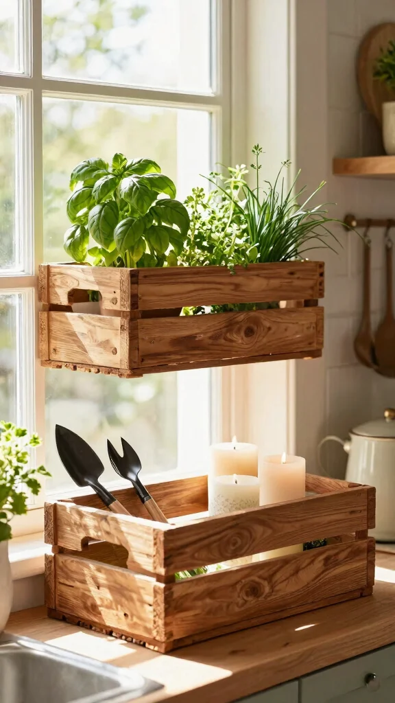 Arrange your crates in varied orientations for an eclectic look, filling them with herbs or using them to hold smaller and larger pots. Add decorative elements like candles or cookbooks to create warmth and character. These crates not only serve as stunning plant displays but also become delightful conversation starters in your kitchen!