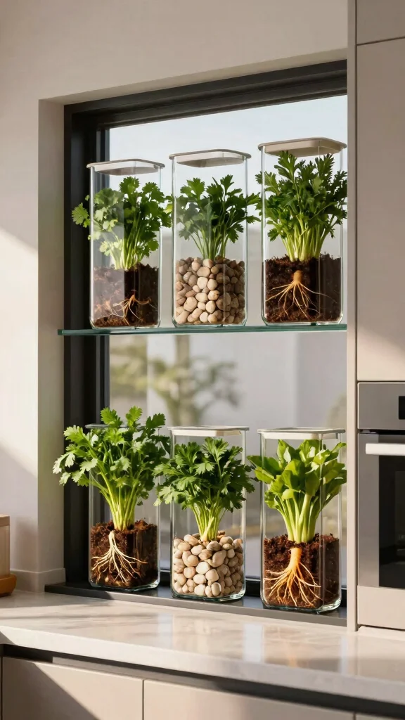 Choose from various shapes and sizes, like mason jars or elegant terrariums, and mix herbs in different tinted glass for an eye-catching display. Arrange these containers along your kitchen window, pairing them with small stones or pebbles for added texture. Watch your herbs thrive while enriching your kitchen with a fresh vibe!