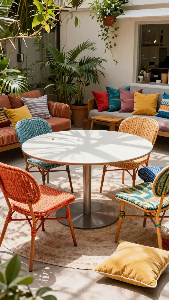 While bohemian-style furniture is our top choice, vintage options might appeal to those who love a classic look. If you prefer low maintenance, modern minimalist pieces could be your go-to. For eco-conscious readers, upcycled furniture offers a creative approach that’s also sustainable. Choose the style that resonates with you and fits your patio design inspiration!