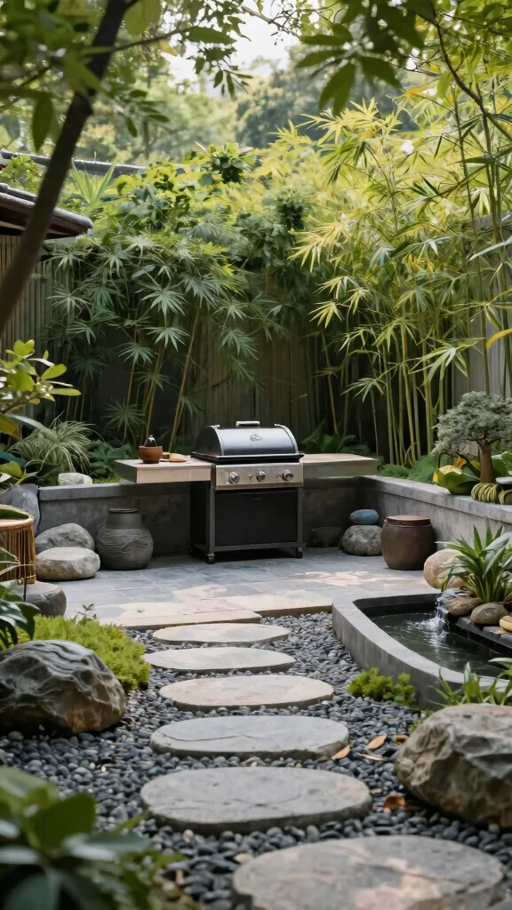 Incorporating features like bamboo, flowing water, and smooth stone paths enhances the peaceful atmosphere of your grill area. It’s about creating a calming escape that serves both function and tranquility.