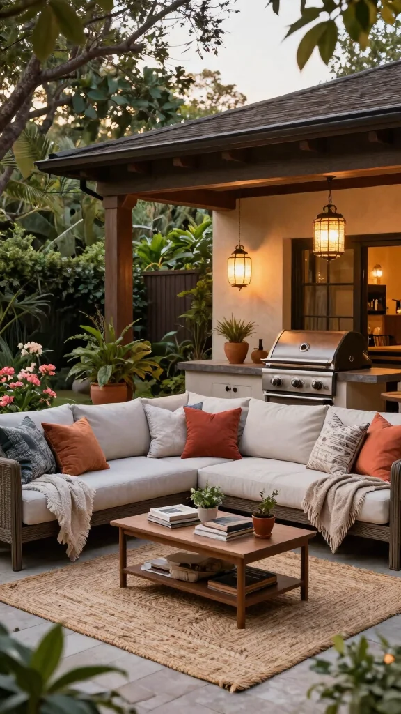 Why not transform your grill area into a cozy outdoor living room? With comfortable seating and stylish decor, you can create a welcoming retreat right in your backyard. Picture plush sectionals adorned with colorful throws and hanging lanterns that add warmth and charm to your space.
