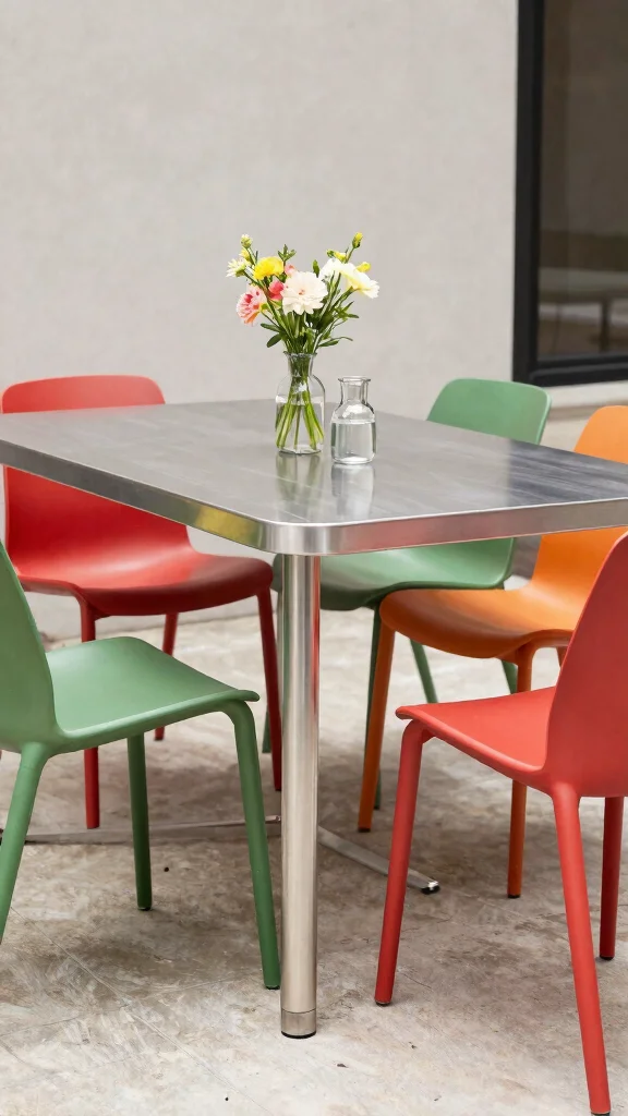A stylish metal dining table adds a modern touch to your outdoor area, perfect for contemporary settings. Choose a design featuring sleek lines and minimalistic features that exude elegance. Pair it with bright accent chairs that introduce a pop of color, creating an inviting and lively contrast.
