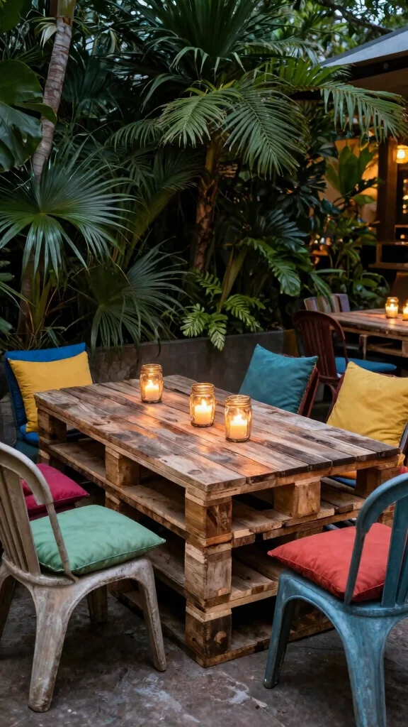 Choose to either paint the pallets in vibrant colors or leave them natural for rustic charm. Pair with outdoor cushions for comfort and add decorative upcycled jar candles or potted plants for a refreshing look.