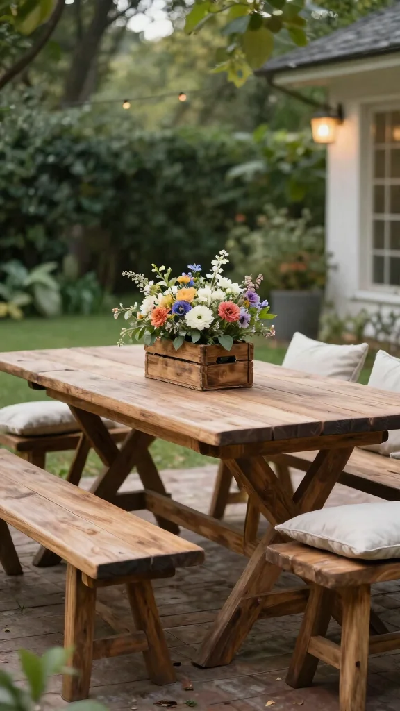Add soft cushions to the benches for comfort and adorn the table with a rustic centerpiece, like a wooden crate filled with seasonal produce or wildflowers. This setting invites warmth and connection among friends and family.
