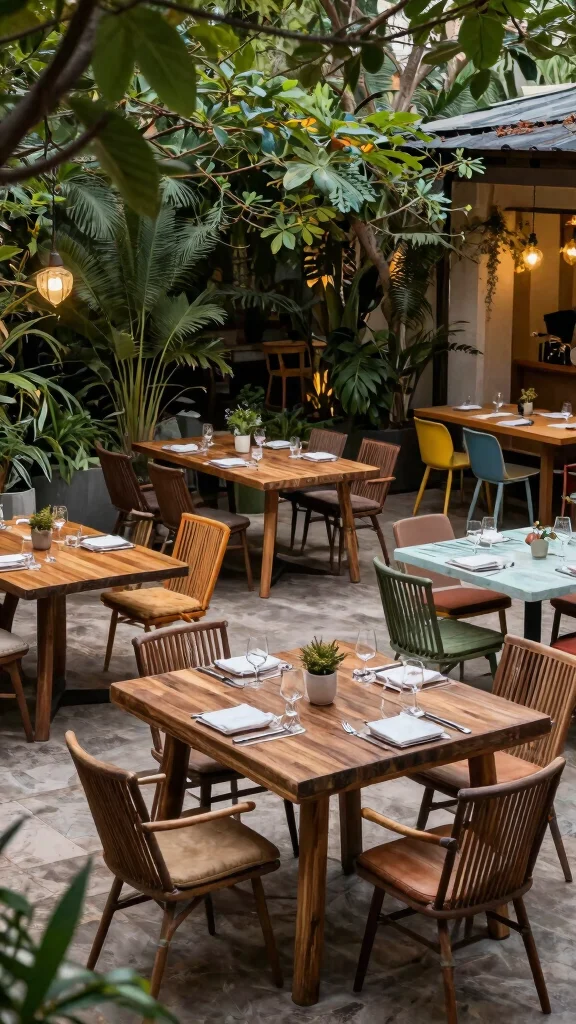 Opt for garden table styles that blend durability with sustainability: extendable teak or reclaimed wood tables, powder-coated recycled metal frames, or concrete tops paired with responsibly sourced veneers. Material options include reclaimed wood, bamboo, recycled plastic, and recycled aluminum. For outdoor dining decor, coordinate planters and accessories with the same materials for a cohesive look. Add energy-saving lighting and native plants to complete the eco-friendly setup.