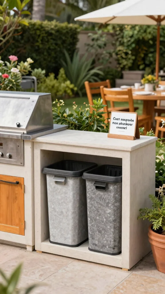 Want to keep your outdoor kitchen eco-friendly? Effective waste management is crucial for a sustainable setup. Establish compost bins for organic waste and designate recycling stations for glass, plastic, and paper, minimizing environmental impact while supporting your gardening efforts.