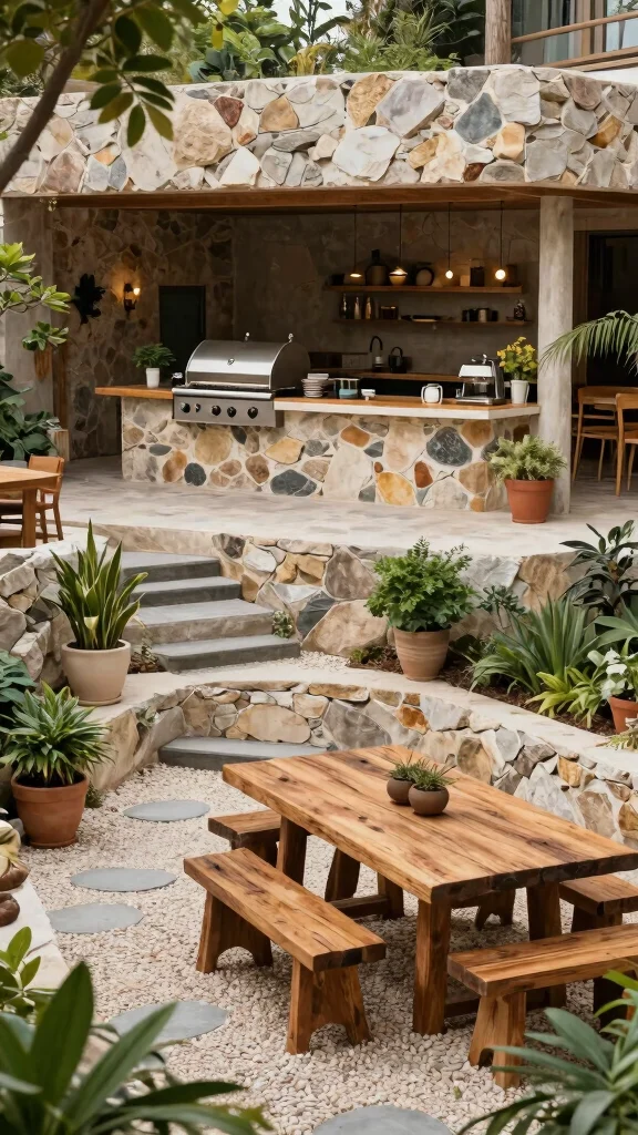 Looking to maximize your outdoor space? Multi-level dining areas can add visual intrigue while enhancing functionality. Different heights for cooking zones, dining tables, and lounge areas connect seamlessly through stylish pathways made of stones or tiles.