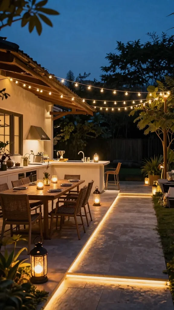 String lights can wrap around your dining area or cooking zone for a festive feel, while solar-powered lanterns promote sustainability. Installing LED lights along pathways not only ensures safety but also guides guests through your outdoor oasis.