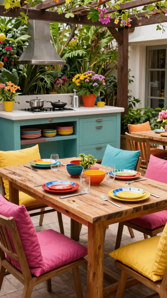 Ready to inject some energy into your outdoor space? Bold colors can create a lively atmosphere in your kitchen and dining areas. Bright dishware, vibrant cushions, or painted furnishings can make the environment inviting and fun.