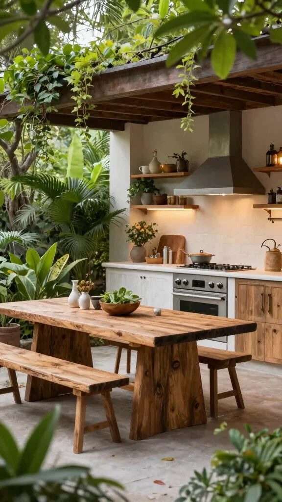 Installing wall-mounted planters or repurposing pallets adds a rustic touch, while the vibrant greenery enhances your outdoor kitchen’s charm. Fresh, homegrown ingredients elevate your meals and enhance the dining experience.